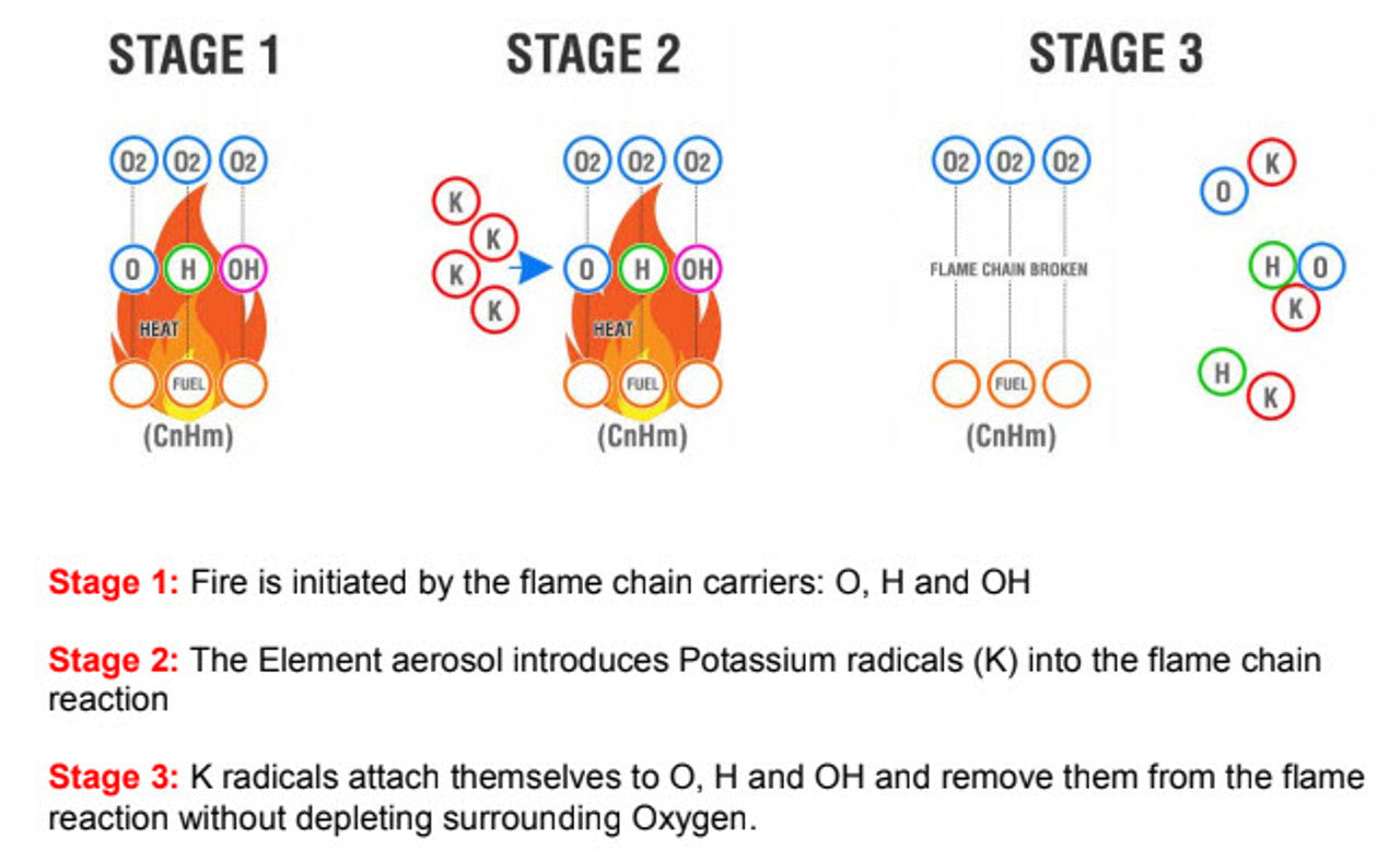 The aerosol that comes out of the unit reacts with the fire. Potassium radicals (K+) capture the Oxygen of the combustion thereby extinguishing it. At the end of the extinguishing process the following is discharged to the atmosphere: