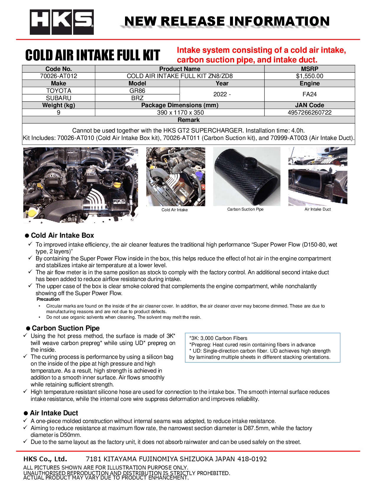 Cannot be used together with the HKS GT2 SUPERCHARGER. Installation time: 4.0h. Kit Includes: 70026-AT010 (Cold Air Intake Box kit), 70026-AT011 (Carbon Suction kit), and 70999-AT003 (Air Intake Duct).