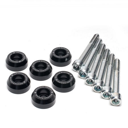 The first of their kind and only available from Skunk2, Lower Control Arm Dress-Up Washers for most 88-00 Civics and 90-01 Integras are available in black, blue, gold, purple, red, and clear hard-anodized finishes. Lower Control Arm Dress-Up Washers substitute the factory lower control arm hardware with tapered, OEM-grade socket-head bolts flush-mounted inside of our unique aluminum washers. Each Lower Control Arm Dress-Up Washer kit includes six washers and six bolts that are compatible with most lower control arms, including Skunk2's.