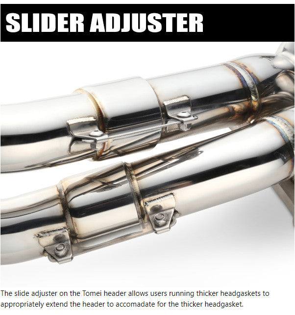 The slide adjuster on the Tomei header allows users running thicker headgaskets to appropriately extend the header to accomadate for the thicker headgasket.
