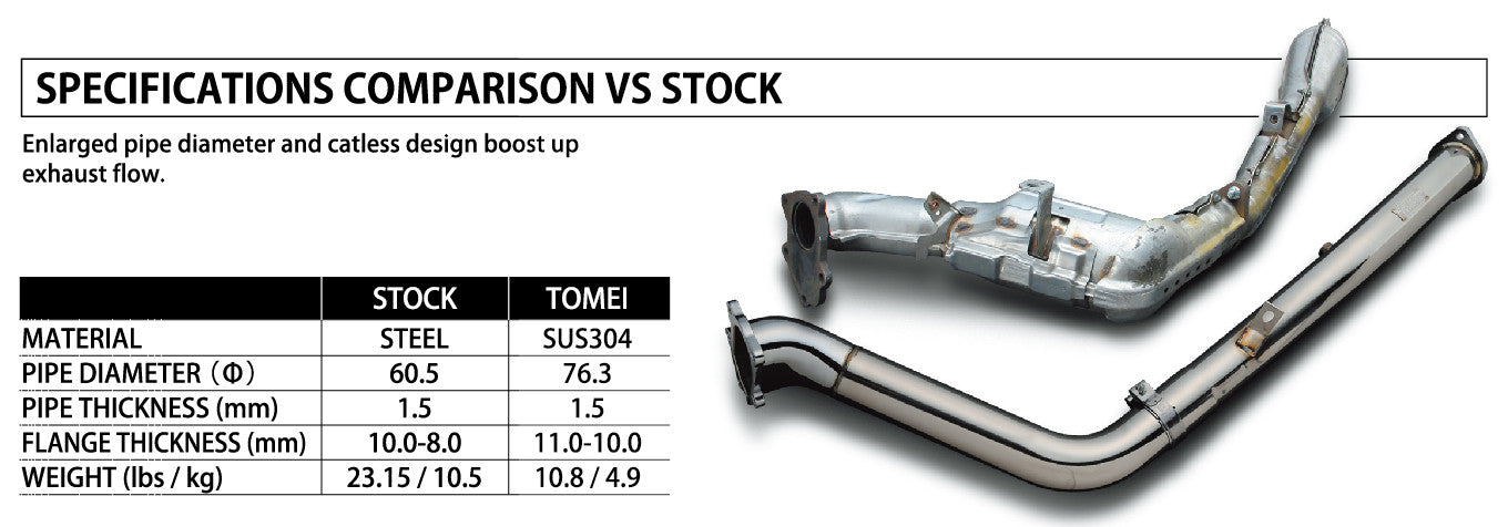 Tomei Catless Straight Down Pipe dramatically improve exhaust flow and significantly reduceover 53% of weight vs. stock down pipe. Addition to massive torque and power increase, lightness dramatically improve handling.