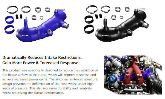 This product was specifically designed to reduce the restriction of the intake airflow to the turbo, which will improve response and achieve increased power gains. The silicones reinforced structural design prevents the deformation of the hose whilst under high loads of pressure. This also increases durability and reliability whilst optimizing the Turbos performance.